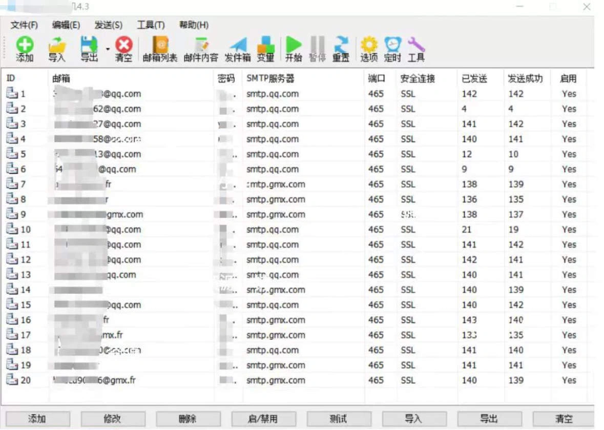 • 1. 无限制发件箱:支持批量导入QQ、163、GMX等各种邮箱,作为你的“发件弹药库”。
