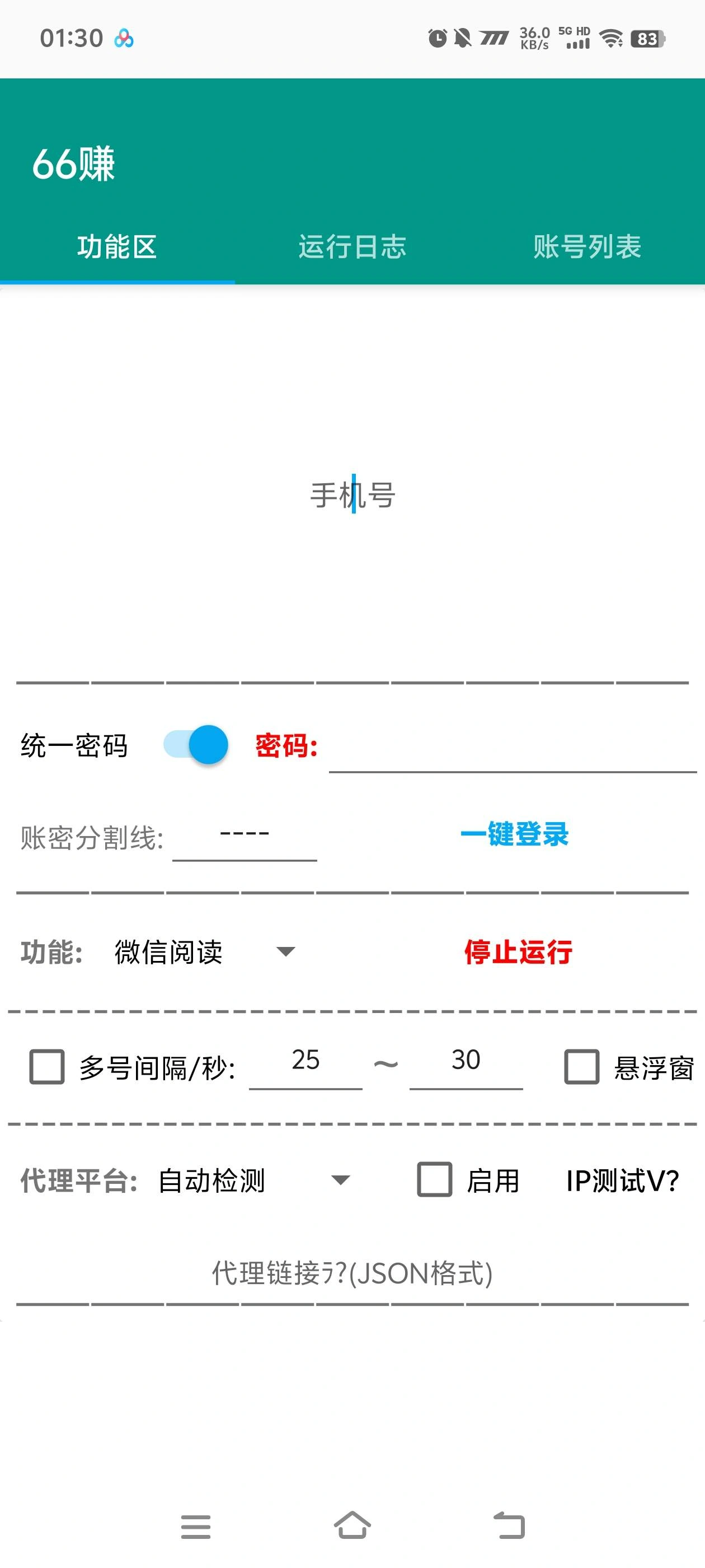• 准备多个微信阅读账号,在软件中输入 “手机号 + 统一密码”,设置 “账密分割线”;