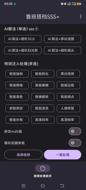 下载并安装鲁班搭档 SSS + 软件(附永久使用权限),根据教程完成初始化。在软件界面选择 “AI 算法”(如 “随机抽帧 10.0”“移动溶图”)和 “特效注入处理”(如 “智能锐化、智能补帧、高清增率”),设置好后保存为默认模板,方便后续批量处理。
