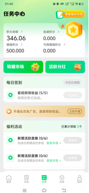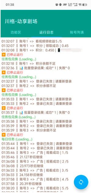 选择 “动享剧场” 功能,点击 “一键运行”,软件自动完成 “登录→观看广告→领取积分” 全流程;积分积累后,在闲鱼、淘宝挂售(标题可写 “动享积分 4.5 米 / 个 秒发”),或加入平台收积分社群批量变现。