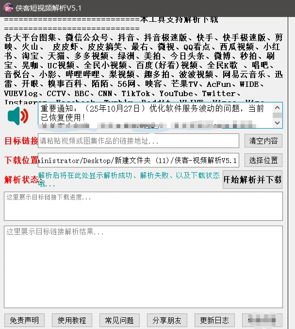 工具是侠客团队开发的电脑端视频解析下载平台(V5.1 版本),核心功能是对全球 300 + 平台的视频、文章、图文进行无水印解析与批量下载,解决自媒体、电商从业者 “素材获取难、去水印繁琐” 的痛点,2 天前更新,已修复 2025 年 10 月 27 日出现的服务波动问题,当前可正常使用。