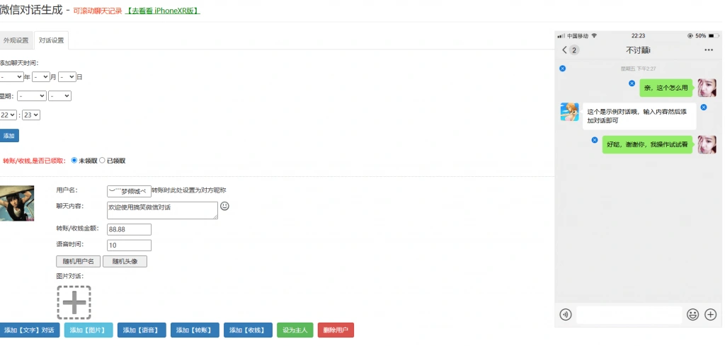 支持添加文字、图片、语音、红包、转账等所有聊天元素。
