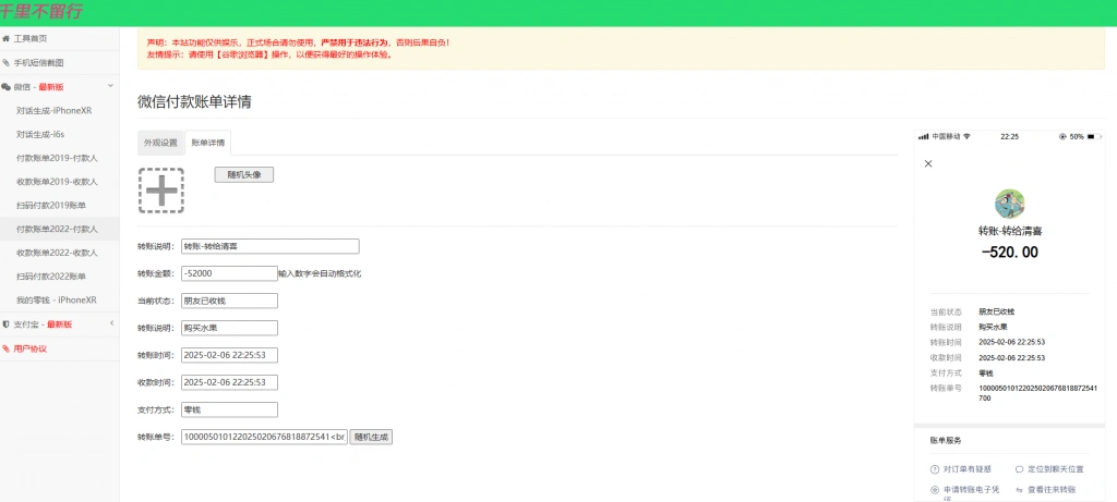 可以自定义转账说明、金额、时间、支付方式、订单号等所有细节。
