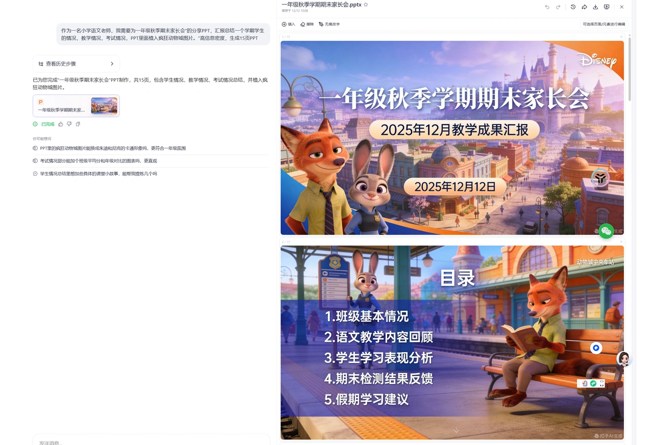 • 这对提示词的要求很大,就是需要时间太长,提示词不到位,整个PPT风格就无法统一。